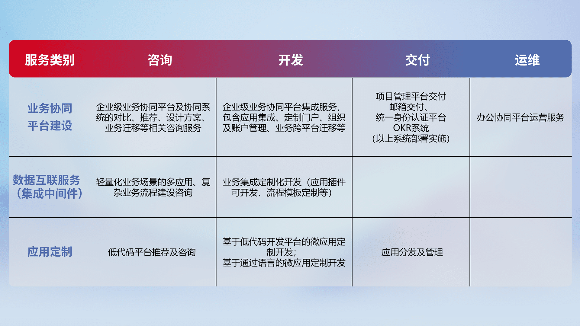 针对钉钉、、、、企微、、IDaas等平台级产品提供产品的规划、、方案、、、、交付、、定制化开发等服务,,,实现如统一协同办公、、智能客户服务、、混合会议管理、、、、智能数据查询、、、等业务场景,,,实现数字化转型。。。
