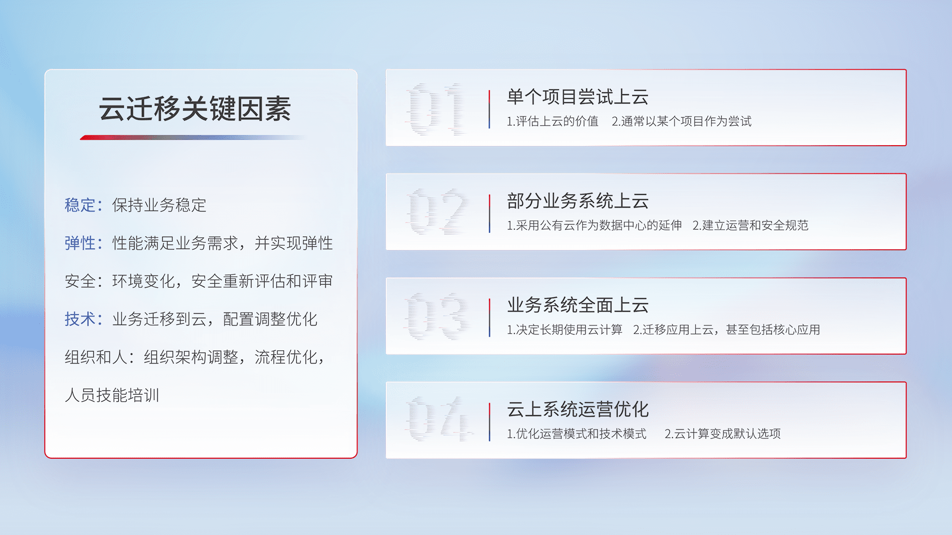 结合实际业务,,从规划设计、、、、云平台选型、、、、云原生改造、、、数据迁移、、集成交付,,迁移全过程为客户识别最佳上云路径,,做好风险识别管理,,,设计网络架构、、、、身份权限、、、安全审计合规、、、、操作审计、、、日志审计、、监控告警策略、、、多站点容灾设计等,,,对云上基础设施进行整体规划,,,,提升IT治理水平,,以满足弹性、、高可用、、、高性能的需求。。